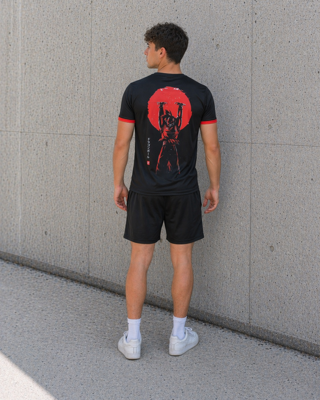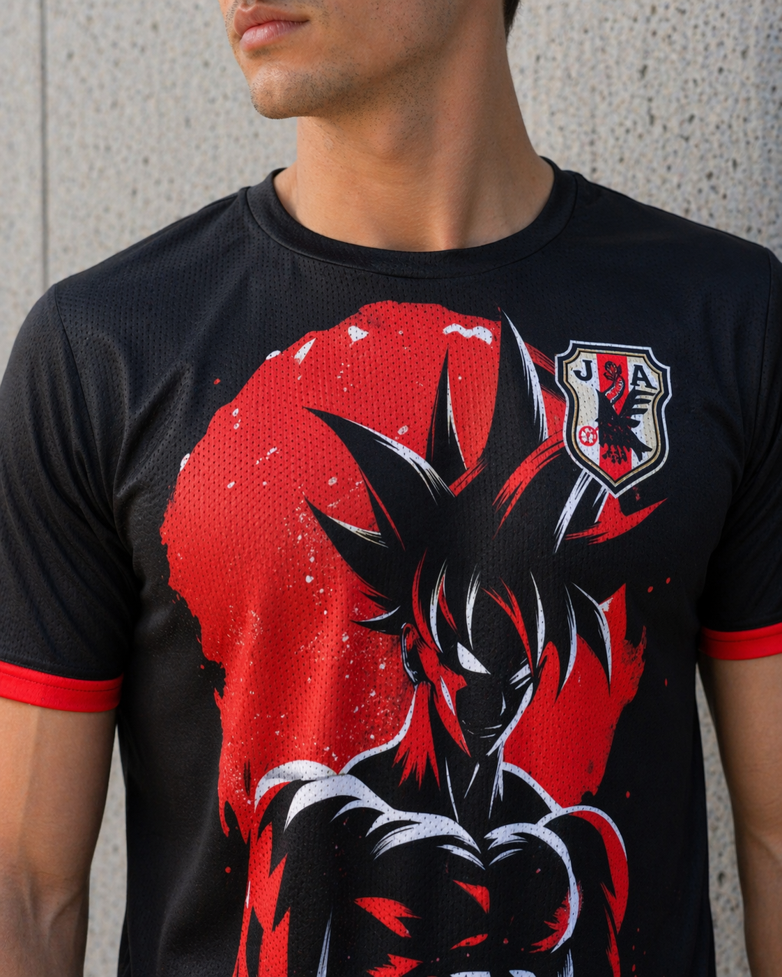 Camiseta edición especial Japón x Goku, corte TechDry, diseño en negro y rojo, ilustración de Goku, escudo japonés. Fusión perfecta entre fútbol y anime